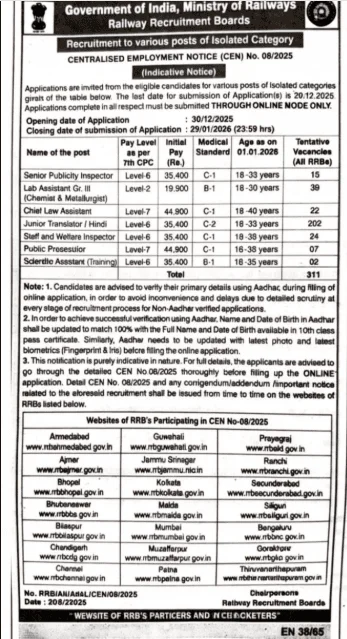 RRB Isolated Categories Recruitment 2026 : Full Information